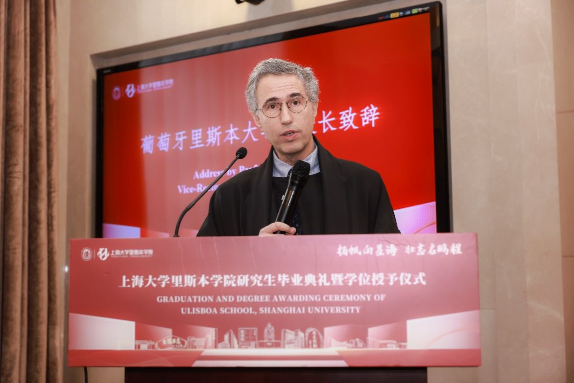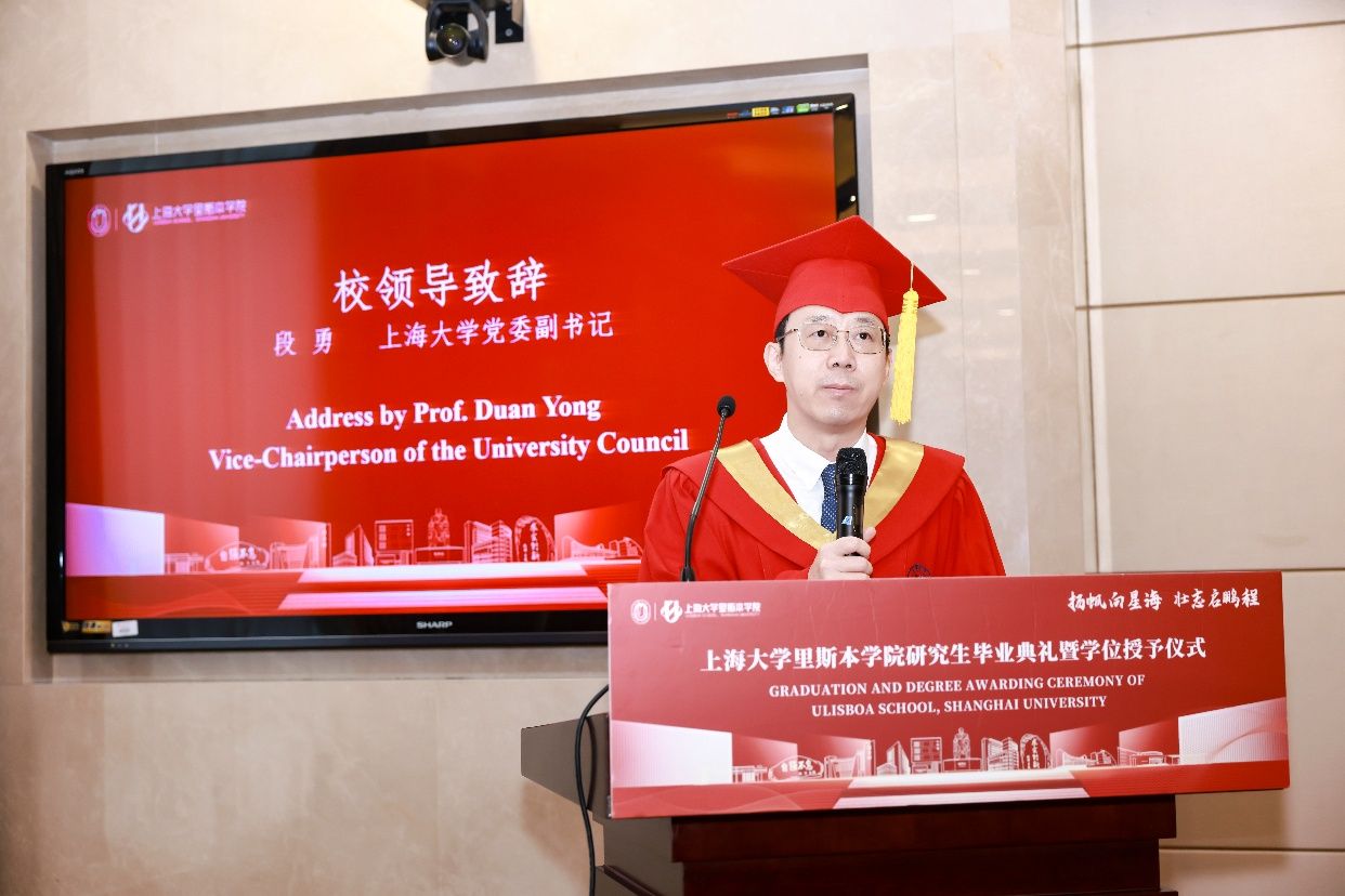 上海大学党委副书记段勇向毕业生们送出寄语。他表示,身处风云际会的时代,大家应当始终葆有强烈的进取意识。当人工智能重新定义人类创造力,当可持续发展成为全球共识,大家在里斯本学院获得的全球视野与批判性思维,将成为应对复杂挑战的独特优势。同学们身上所承载的两座城市交融的基因——里斯本探索未知的航海家勇气,与上海海纳百川的包容智慧,将支撑大家在构建人类命运共同体的征程中贡献独特价值。 “愿你们保持探索的勇气,在未知领域开疆拓土, 愿你们心怀包容的智慧,在差异之中寻求共识, 愿你们带着双城的馈赠,在人生航程中乘风破浪。” 段勇副书记深情寄语,鼓励同学们勇于在无人区栽种第一棵树,善于在不同文明间编织理解的纽带,书写出无限精彩的人生华章。