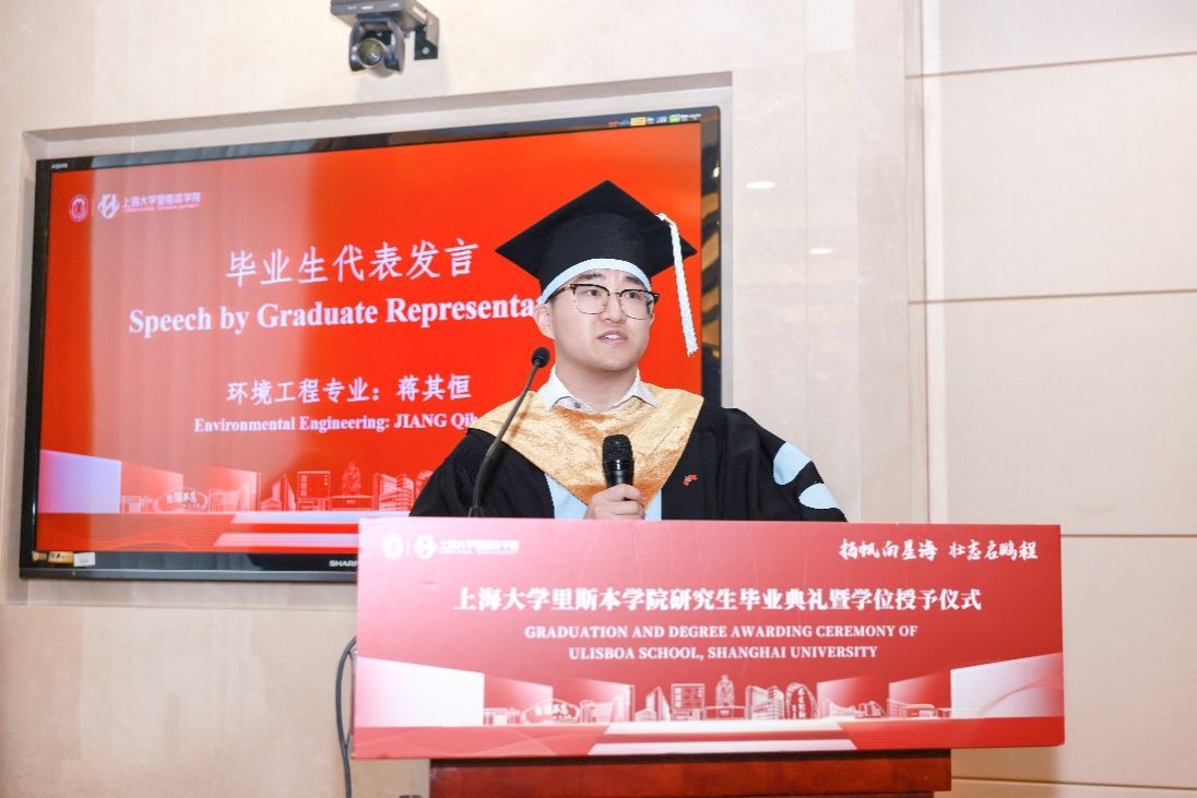 “两校的精神,在我们身上交汇;它们化为同一个信念——以开放的胸怀和坚定的理想,让知识成为连接世界的桥梁,让责任成为前行的方向。”在2025届研究生毕业典礼上,环境工程专业毕业生蒋其恒作为毕业生代表发言,他表示,从上海到里斯本,大家亲身经历了两种文化、两种教育体系的交流与融合。未来的道路依然漫长,世界也在不断变化,但大家已经在两年的研究生生涯里习得了在变化中寻找方向的勇气与智慧。后浪奔涌,终成巨澜,蒋其恒的发言不仅是个人成长的注脚,更是一代青年对时代的回答。